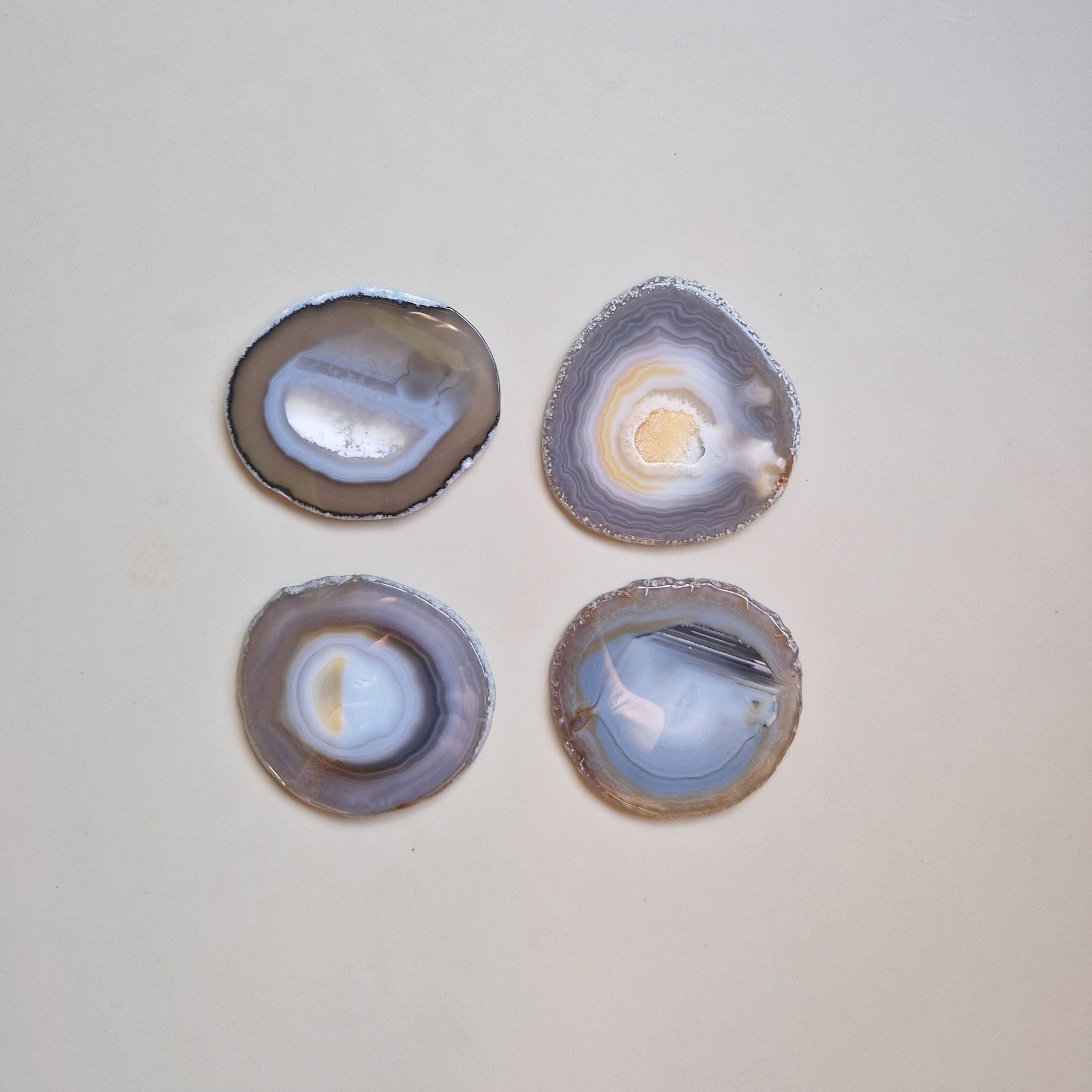 Onderzetters van echte agaatsteen, uniek in kleur en tekening. Een tijdloos detail dat rust brengt op tafel en de natuur dichtbij houdt.