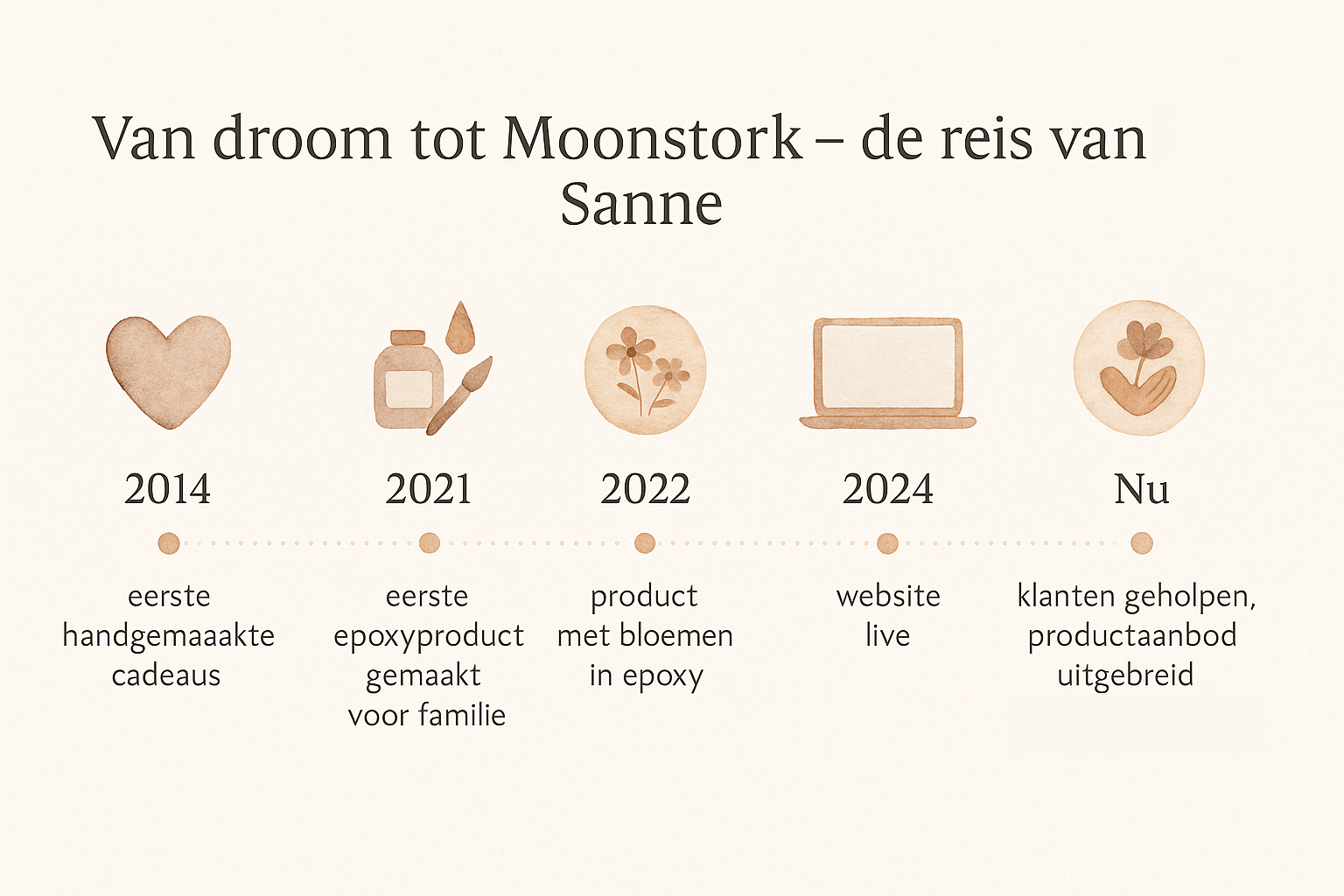 In 2024 ging de Moonstork-website live en in 2025 nam Sanne de stap om haar baan bij haar werkgever te beëindigen. Ze besloot zich volledig te richten op Moonstork, klaar om haar creativiteit en passie te delen met anderen. Haar missie: iedereen de mogelijkheid bieden om de dierbare momenten in hun leven te koesteren.